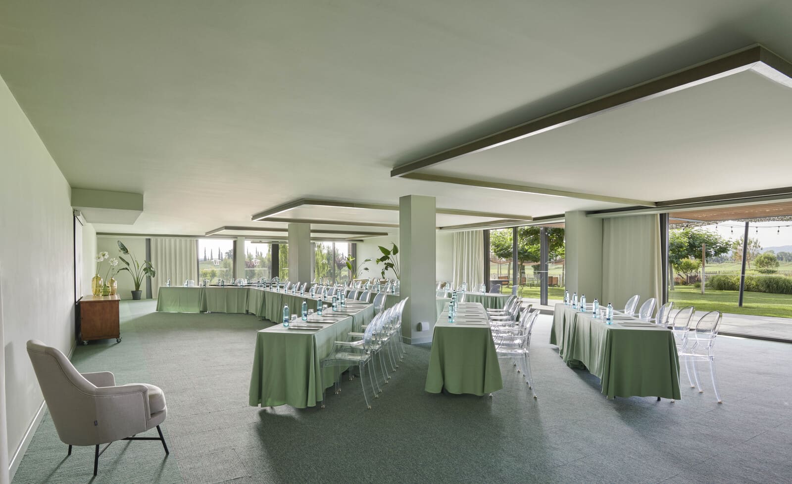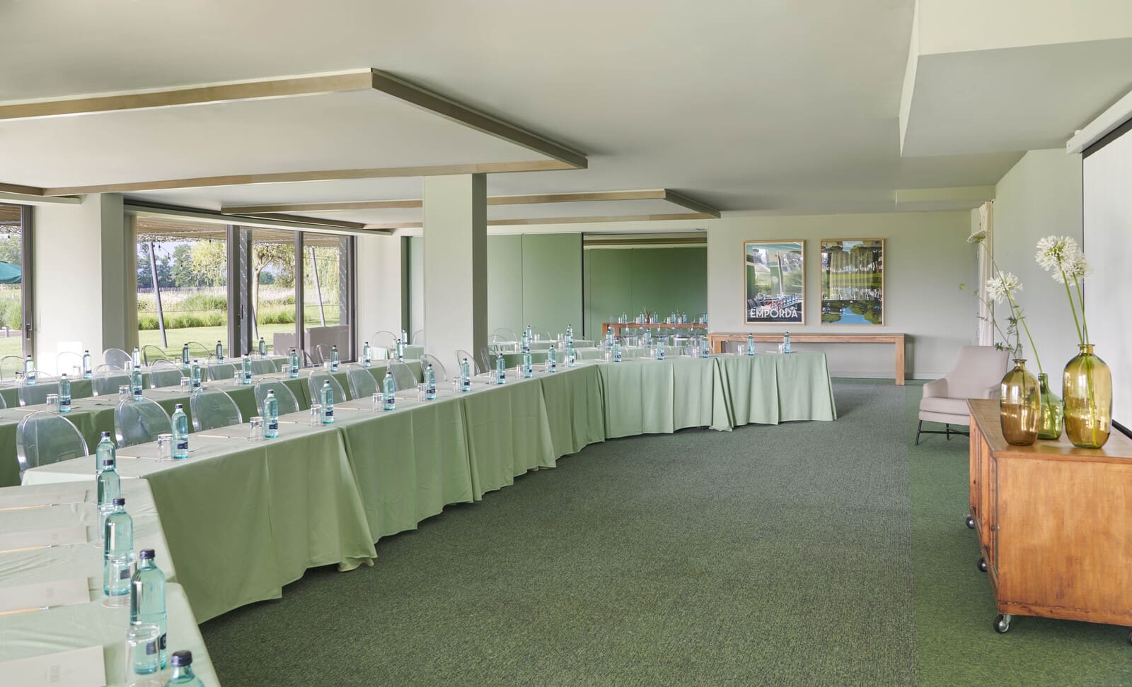 Hotel Terraverda en Empordà Golf Resort, ubicado entre los mejores campos de golf de la Costa Brava y rodeado de naturaleza y paisajes únicos, es el escenario perfecto para todo tipo de eventos. Sus espacios interiores, elegantes y luminosos, ofrecen una sala principal de 246 m² con capacidad para 200 personas, equipada con tecnología y adaptable a cualquier formato: banquete, cóctel, escuela o teatro.